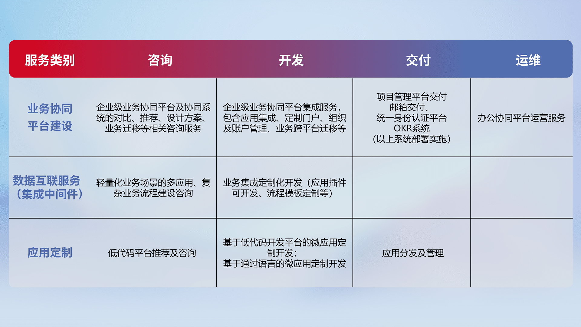 针对钉钉、、、企微、、IDaas等平台级产品提供产品的规划、、、方案、、、交付、、、、定制化开发等服务,,实现如统一协同办公、、、智能客户服务、、混合会议管理、、、智能数据查询、、、、等业务场景,,实现数字化转型。。。。