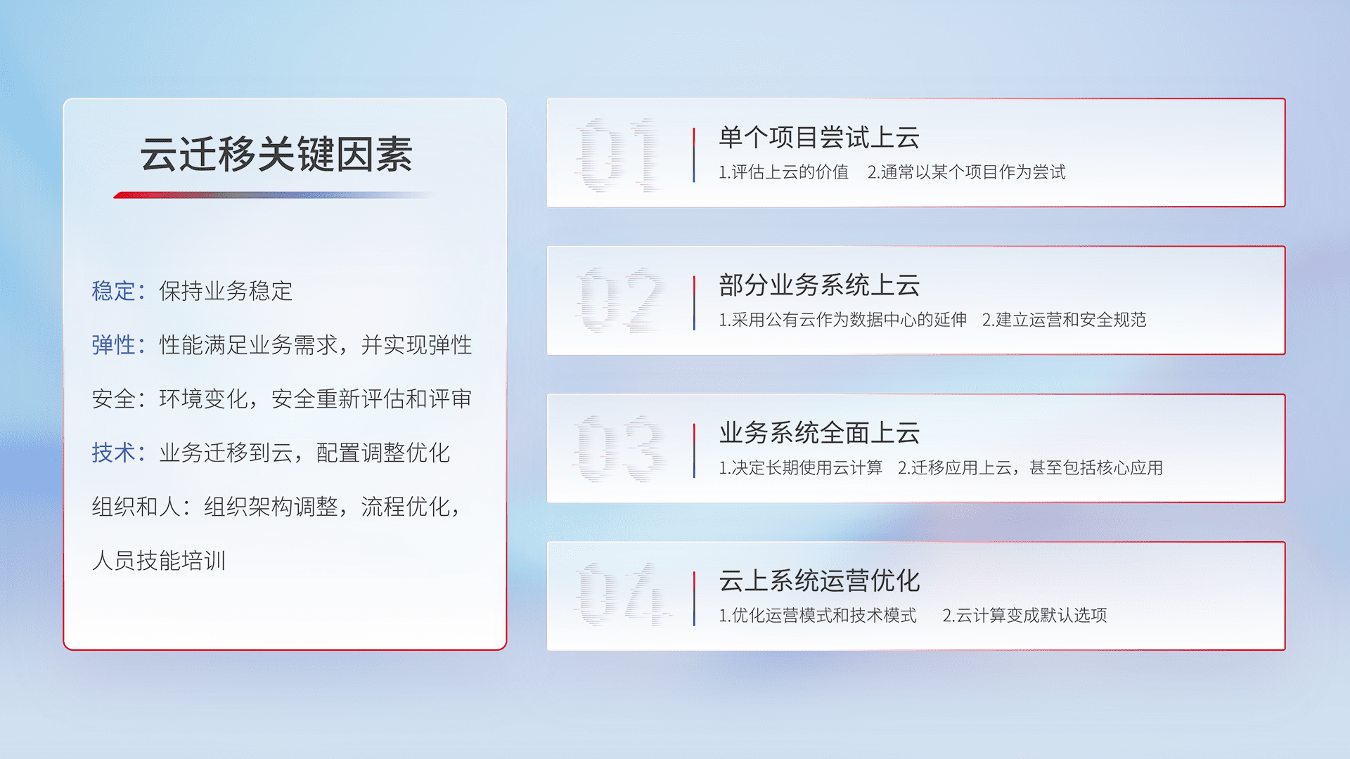结合实际业务,,,,从规划设计、、、云平台选型、、、云原生改造、、、、数据迁移、、、、集成交付,,,,迁移全过程为客户识别最佳上云路径,,,,做好风险识别管理,,,,设计网络架构、、、身份权限、、、安全审计合规、、操作审计、、、日志审计、、、、监控告警策略、、、、多站点容灾设计等,,对云上基础设施进行整体规划,,,,提升IT治理水平,,,,以满足弹性、、高可用、、高性能的需求。。。。