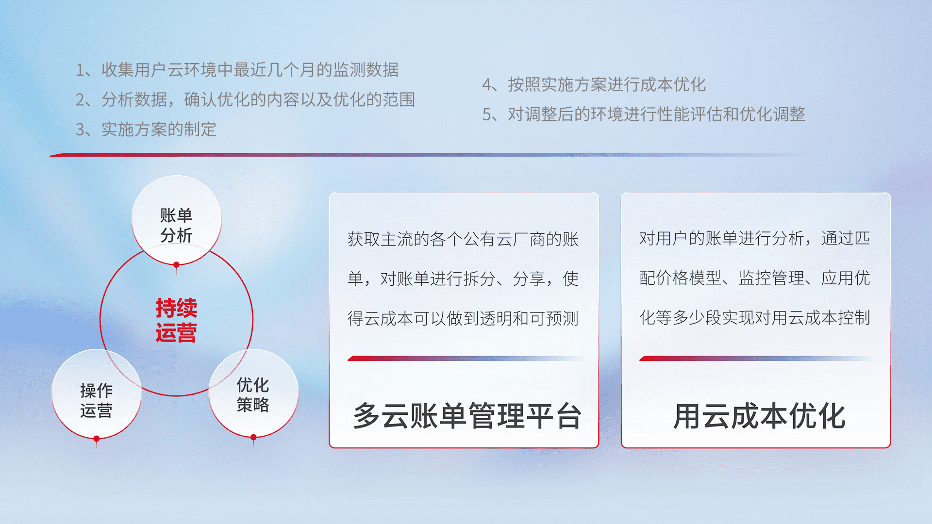 通过多云纳管,,以统一的资源数据模型把客户的云资源进行抽象和封装,,进而实现对多云资源的统一操作,,,保障云资源管理的可靠性、、稳定性与可用性。。。。量身定制化运维内容,,配置、、、、开发运维、、补丁管理、、、、备份、、监控、、、、认证和访问管理、、、、审计和日常巡检等,,,,保障在用云过程中的可靠度,,,稳定度以及高可用率。。。